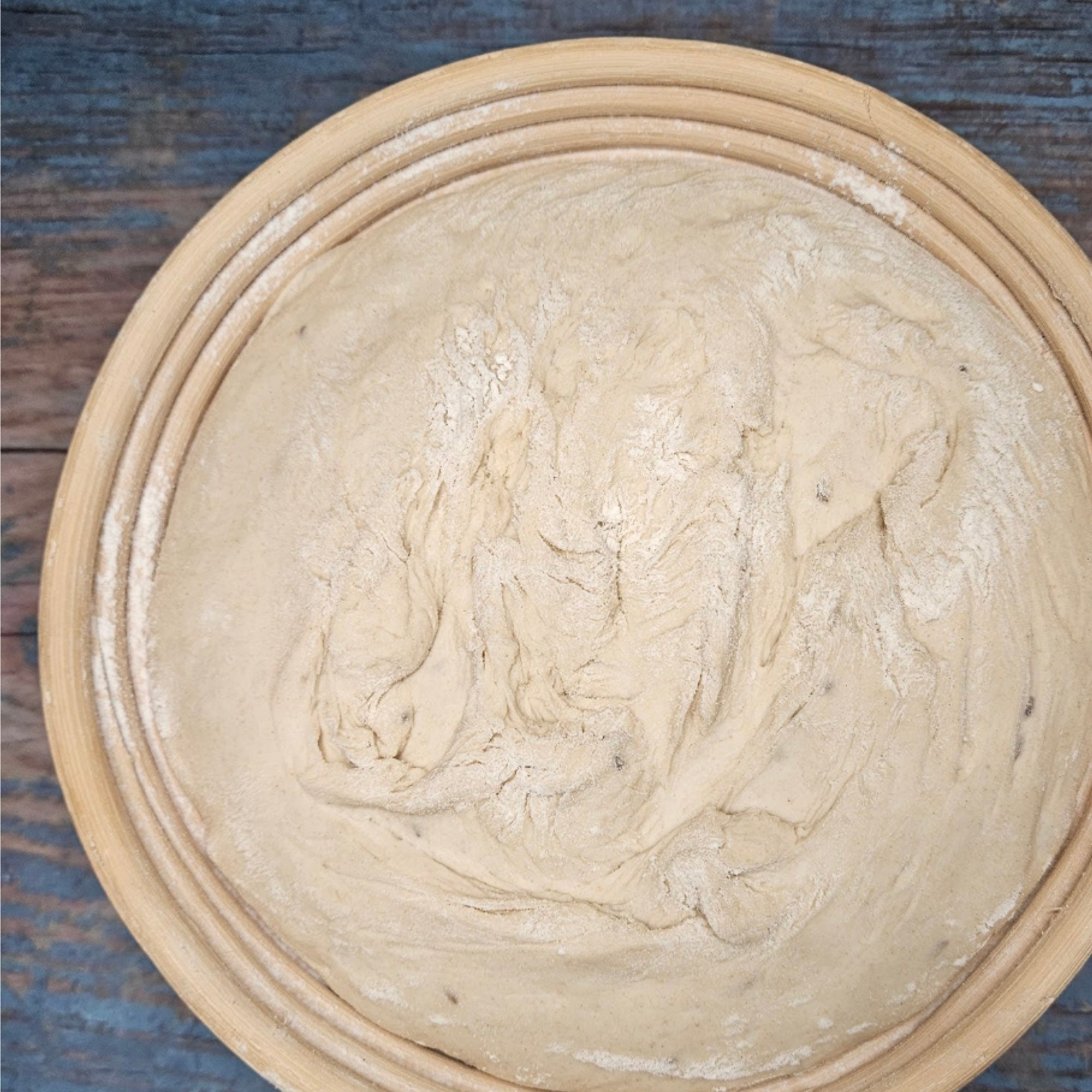 - Stürze den Teig auf die leicht bemehlte Backmatte, forme ihn rund und lege ihn in das bemehlte Gärkörbchen. Bedecke es mit der Leinenhaube und lass den Teig 30–60 Minuten ruhen.