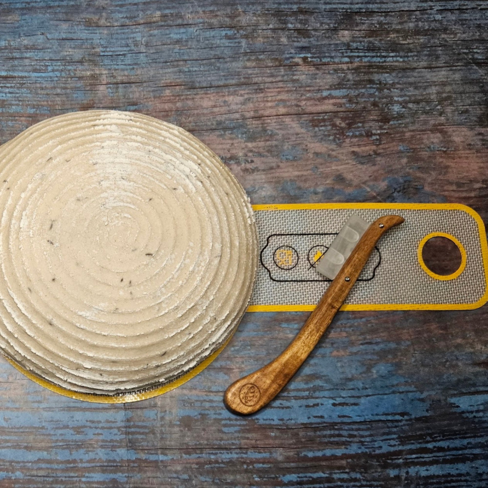- Stürze den Teigling auf die Brotschlinge und schneide ihn mit dem Bäckermesser nach Belieben ein – z. B. ein einfaches Kreuz.