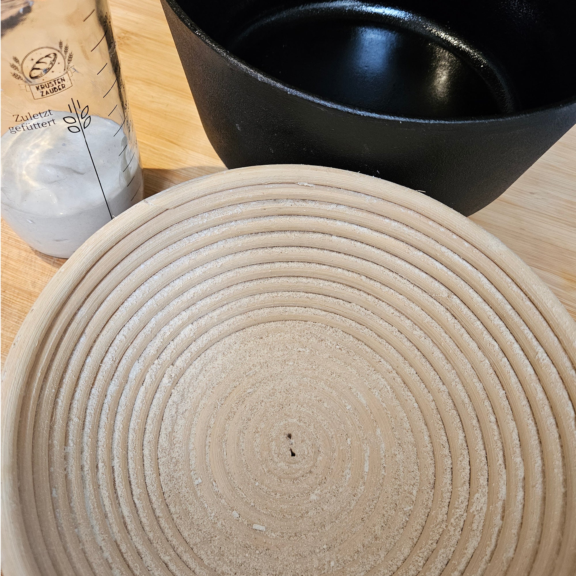 - Gib den Teig auf die bemehlte Backmatte, forme ihn vorsichtig zu einer Kugel und lege ihn mit dem Schluss nach oben in das bemehlte Gärkörbchen. Decke ihn mit der Leinenhaube ab und lasse ihn 30–60 Minuten gehen.