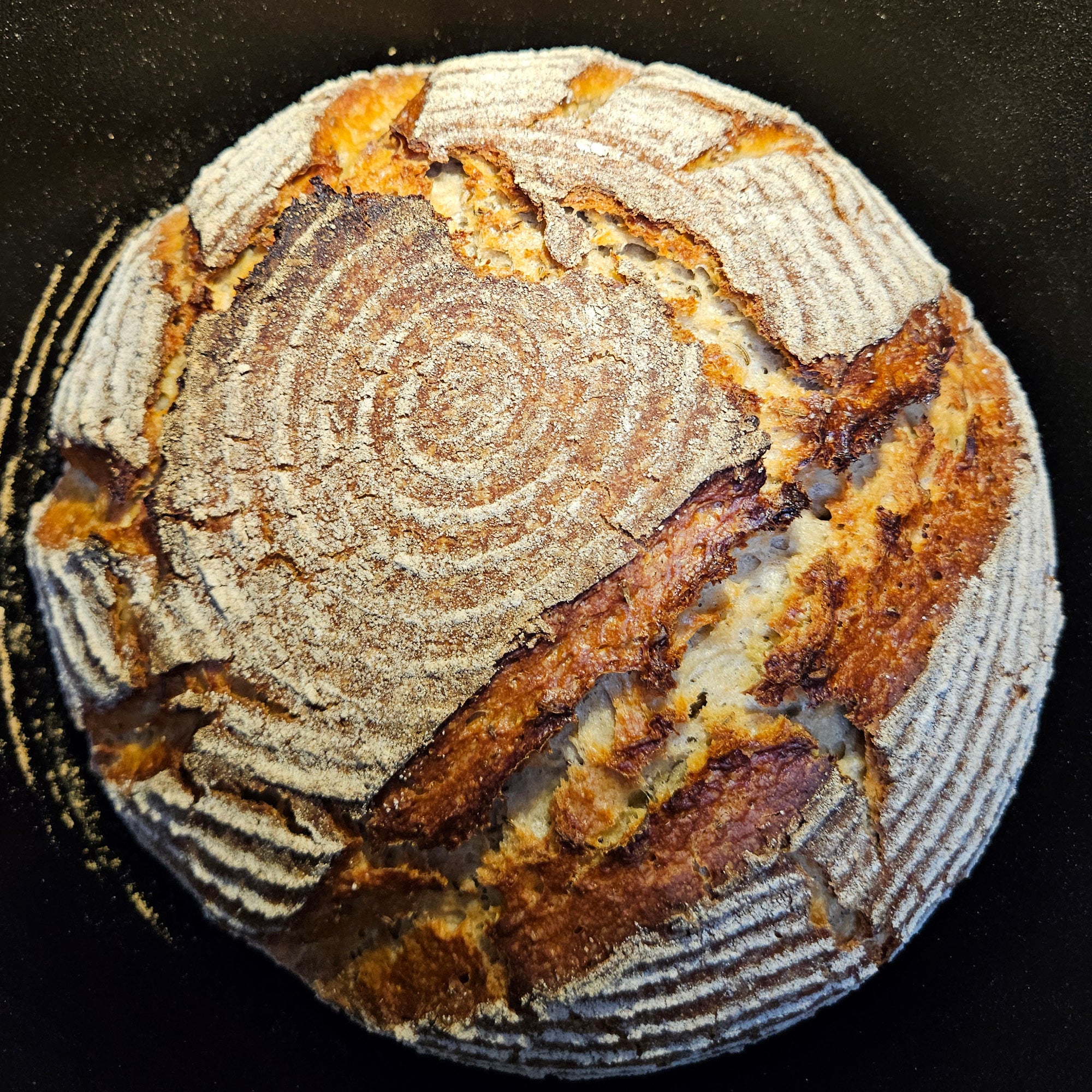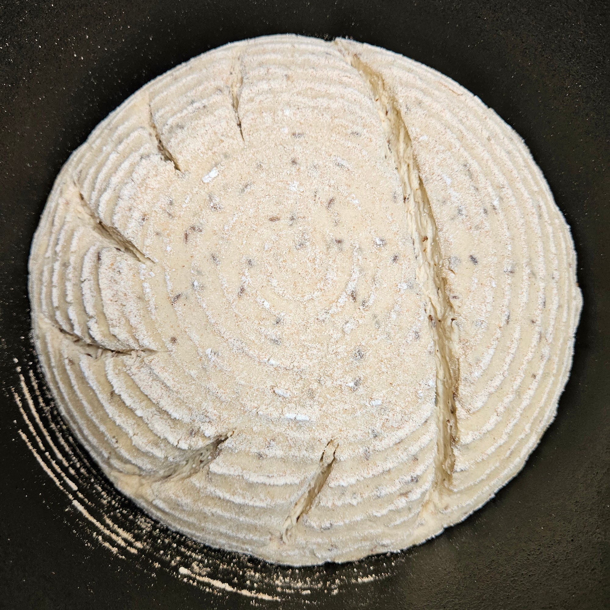 - Stürze den Teigling auf die Brotschlinge, schneide ihn mit dem Bäckermesser nach Belieben ein und gib ihn vorsichtig in den heißen Topf. Backe 25 Minuten mit geschlossenem Deckel.