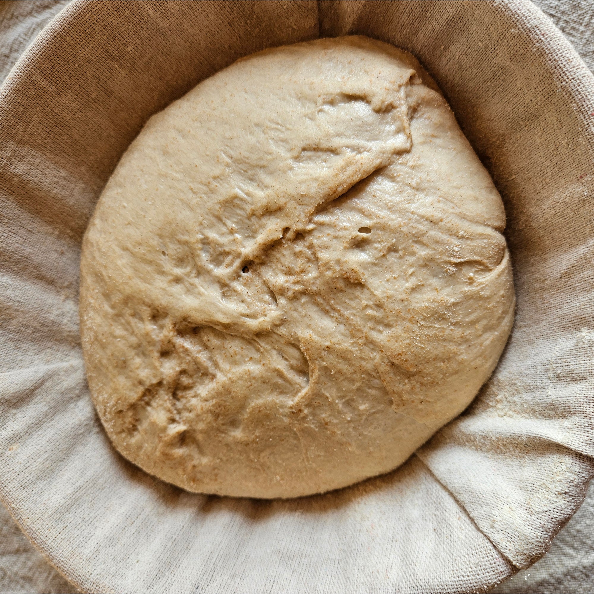 - Nimm den Teig am Morgen aus dem Kühlschrank, gib ihn auf die bemehlte Backmatte und forme ihn vorsichtig zu einer Kugel (auch „rund wirken“ genannt). Lege ihn mit dem Schluss nach oben in das bemehlte Gärkörbchen und decke ihn mit der Leinenhaube ab. Den Teig 1 Stunde bei Raumtemperatur ruhen lassen.