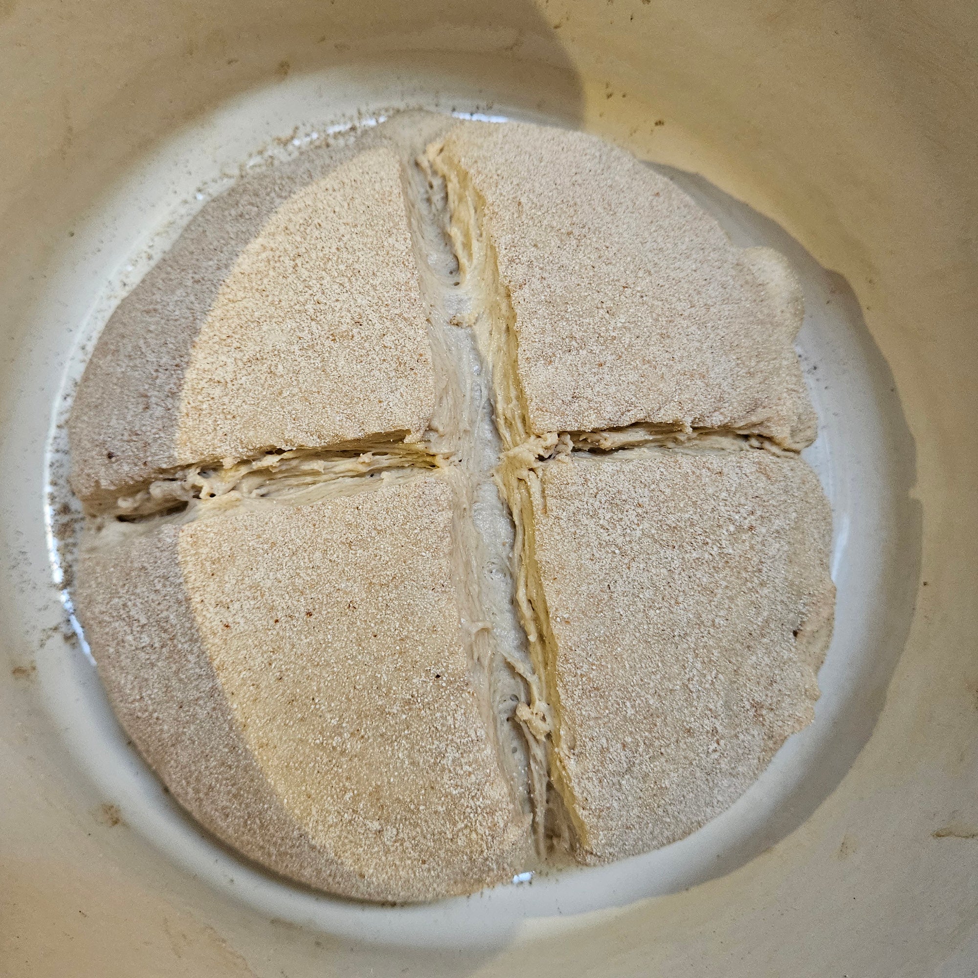 - Lass den Teig in der Schüssel 30 Minuten ruhen, dann einmal dehnen und falten. Nach weiteren 30 Minuten nochmals dehnen und falten.