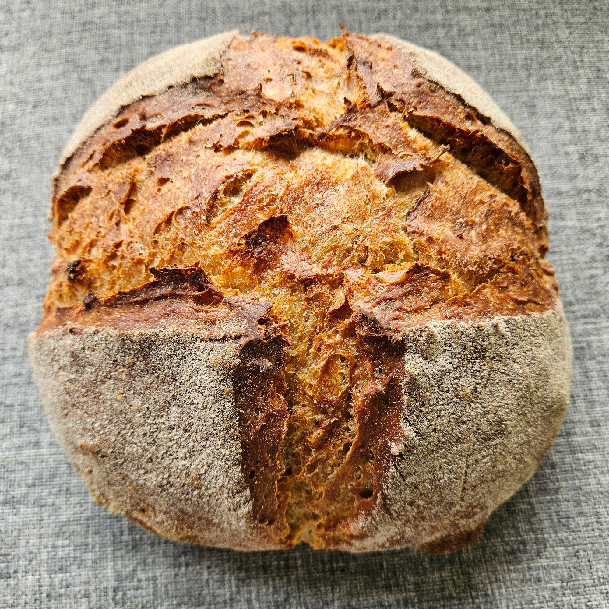 - Stürze den Teigling auf die Brotschlinge und schneide ihn mit dem Bäckermesser nach Belieben ein (z. B. ein Kreuz). Gib ihn anschließend vorsichtig in den heißen Topf. Backe das Brot 20 Minuten mit geschlossenem Deckel, dann 15–20 Minuten ohne Deckel bei reduzierter Temperatur von 220 °C fertig.